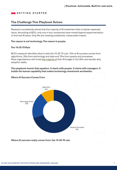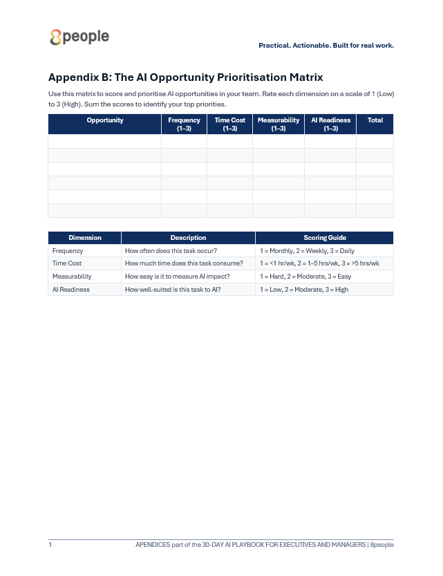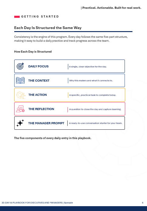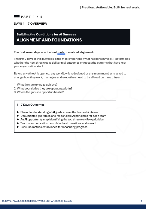 The 8people 30-Day AI Playbook is a practical day-by-day program that takes executives and managers from AI-curious to AI-confident in 30 days. The program delivers measurable outcomes at every stage and enables organisations to scale their business from day one.