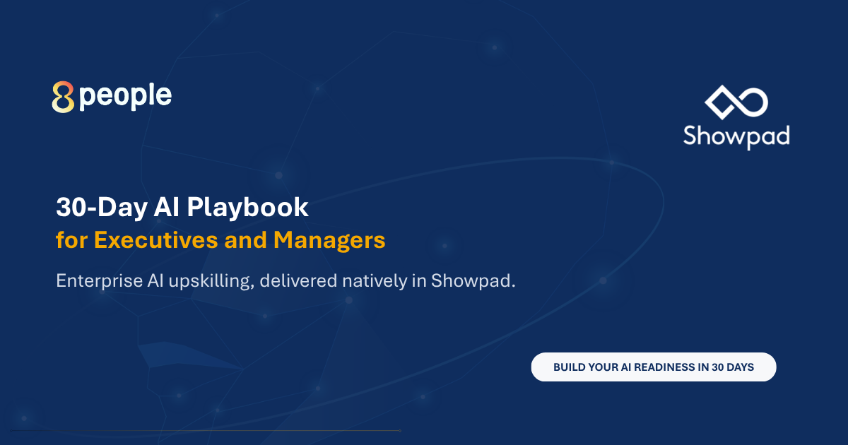 Showpad partners with 8people to drive AI transformation in your organisation. The 30-Day AI Playbook is a practical step-by-step guide that enables humans to transform organisational performance through use of technology and AI.