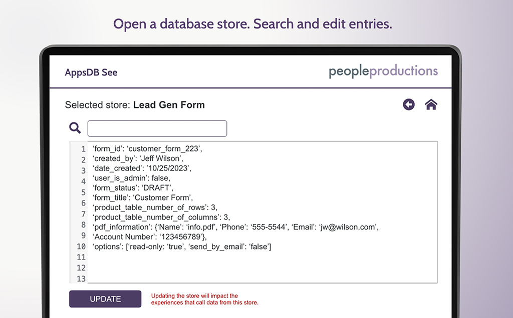 Also, your developer team is likely struggling with keeping track of the databases they have made within Showpad. What are the data store names, how can we best create coordinated store names, or has a store been lost that has valuable information your team has collected? With AppsBD See you’ll be able to see all your available data stores listed on one screen, then click on them to see the actual stored data. In AppsDB See, you can rename, customize data sorting, and edit your data stores.