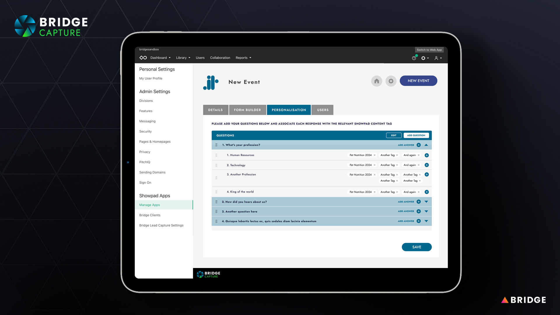 Introducing Bridge Capture the end-to-end solution for capturing leads at live events. Empower your sales reps to rapidly capture contact details by simply scanning a business card or name badge and saving them to Showpad. Additional features include a questionnaire builder, automated content asset recommendations and a lead rating system.