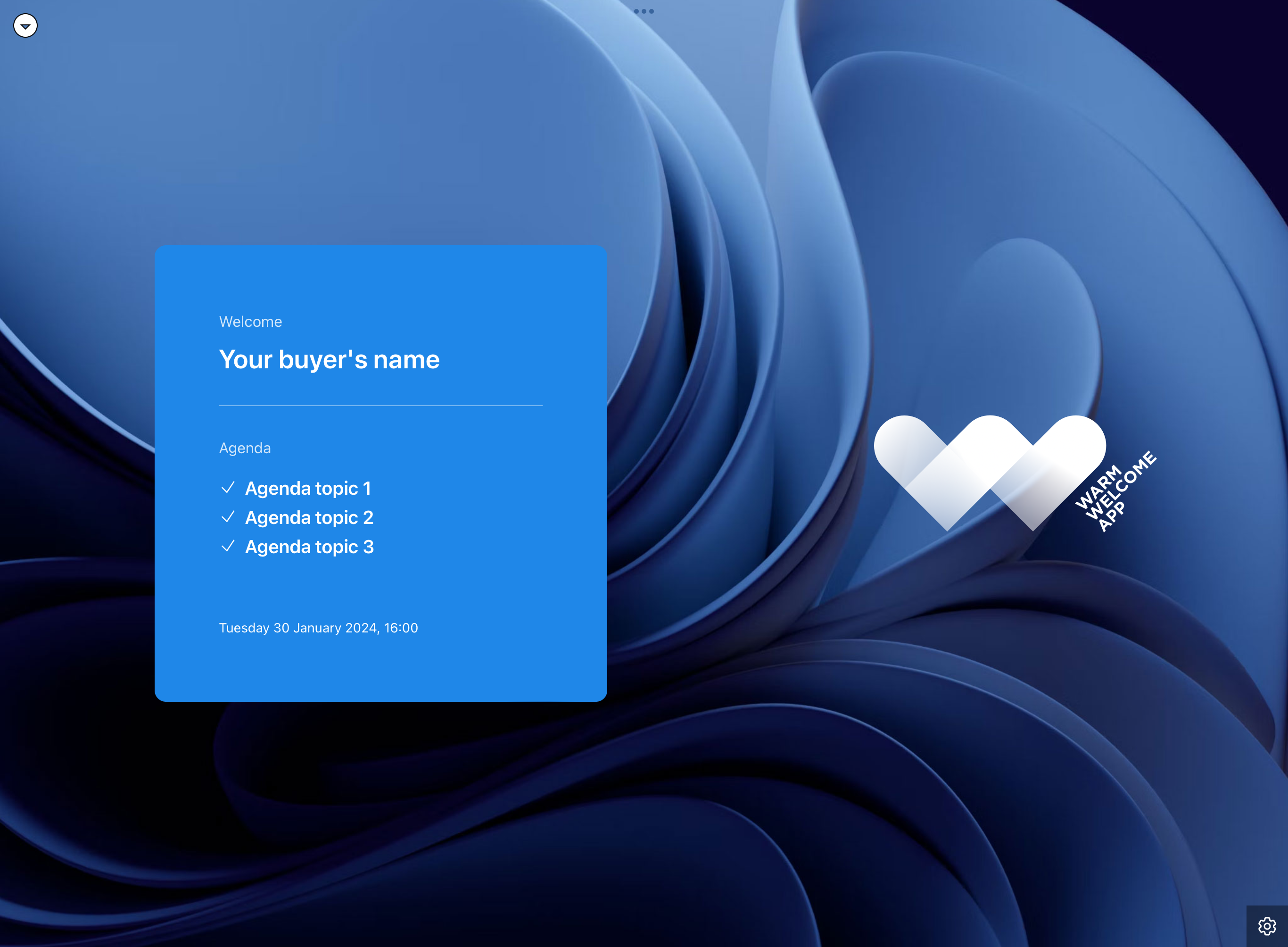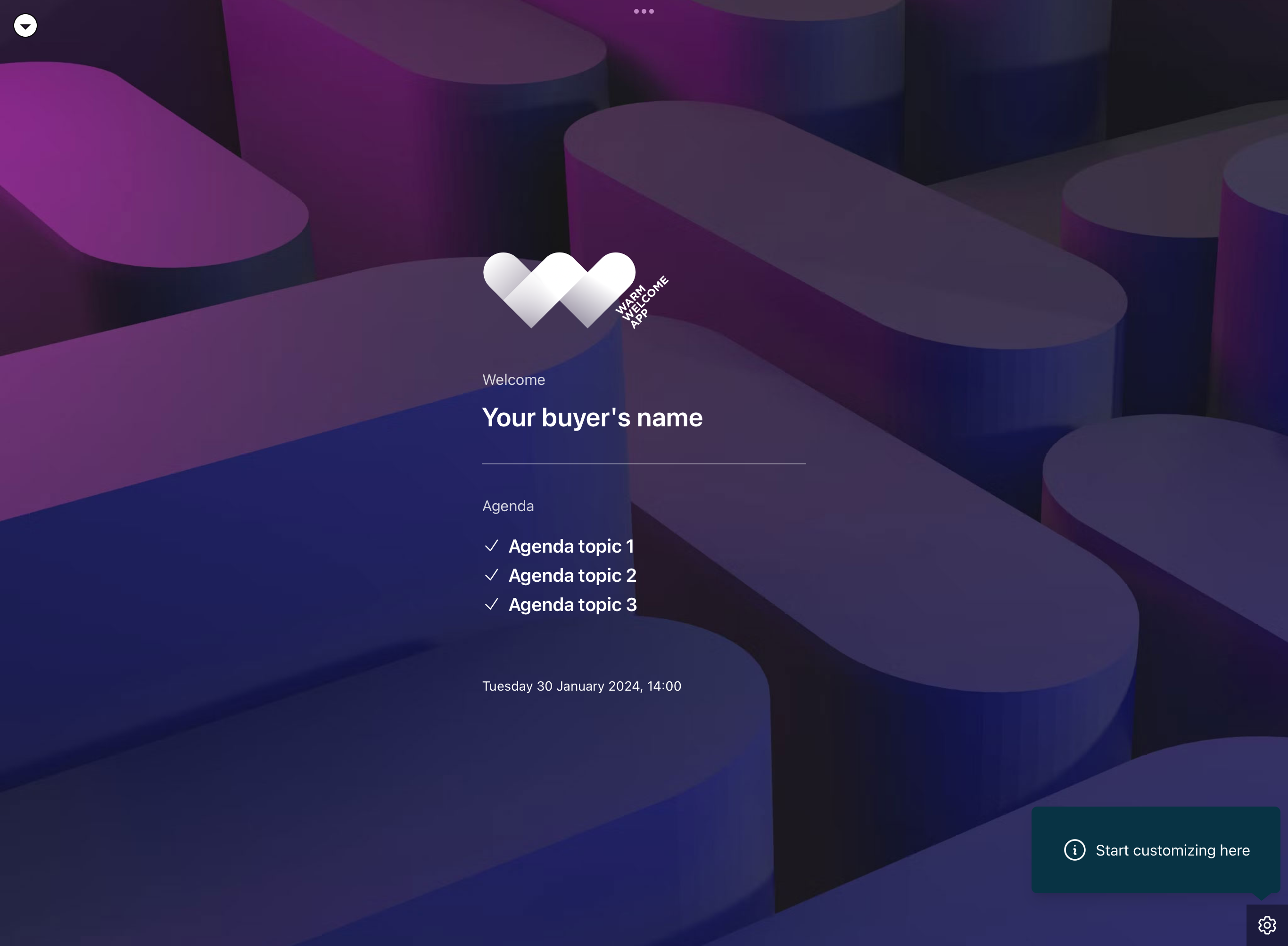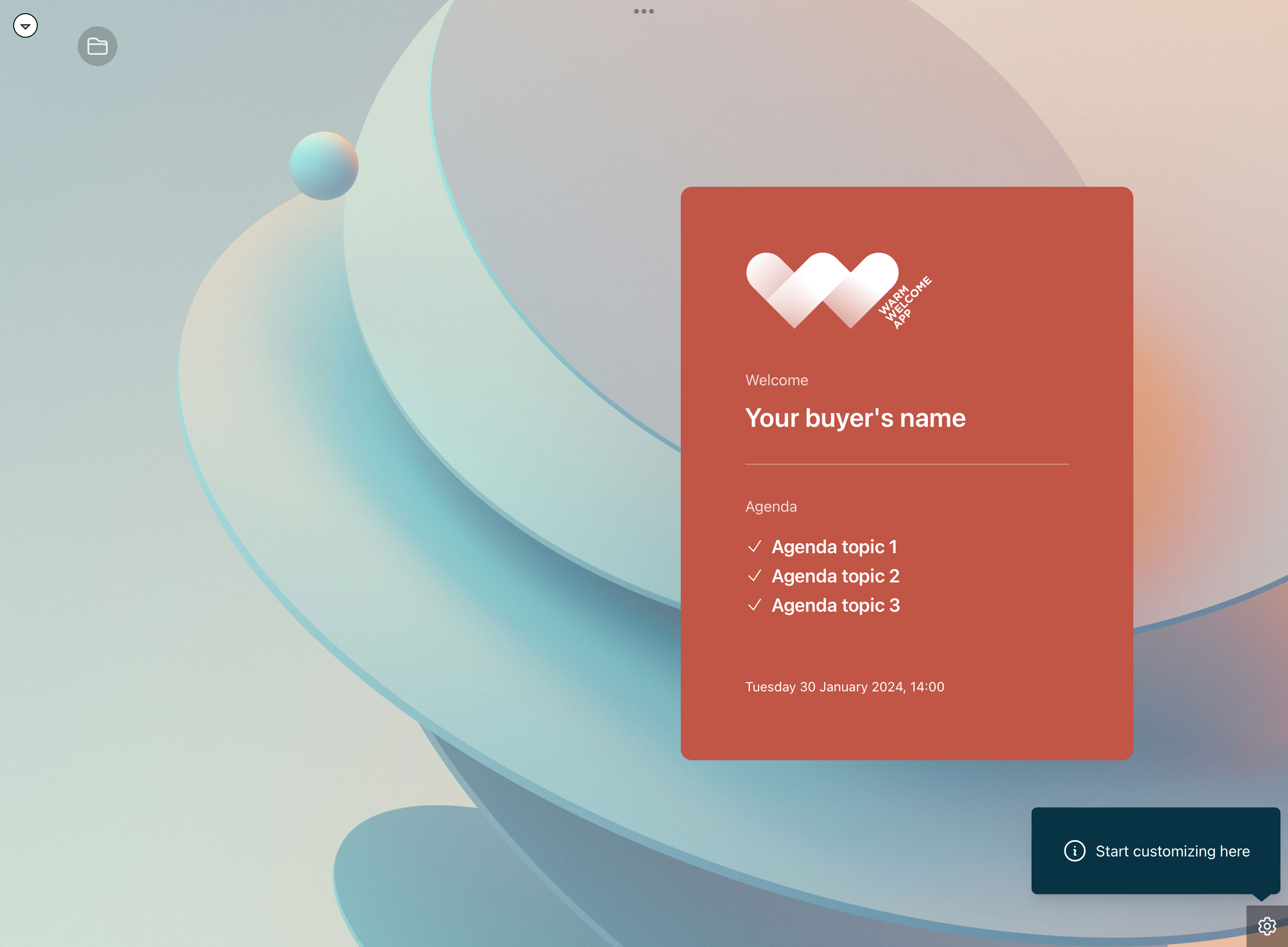 Go above and beyond by personalizing the experience with your buyer's logo, name, and agenda topics. It's not just a welcome screen; it's a tailored masterpiece that speaks volumes about your dedication to creating a unique and memorable encounter.