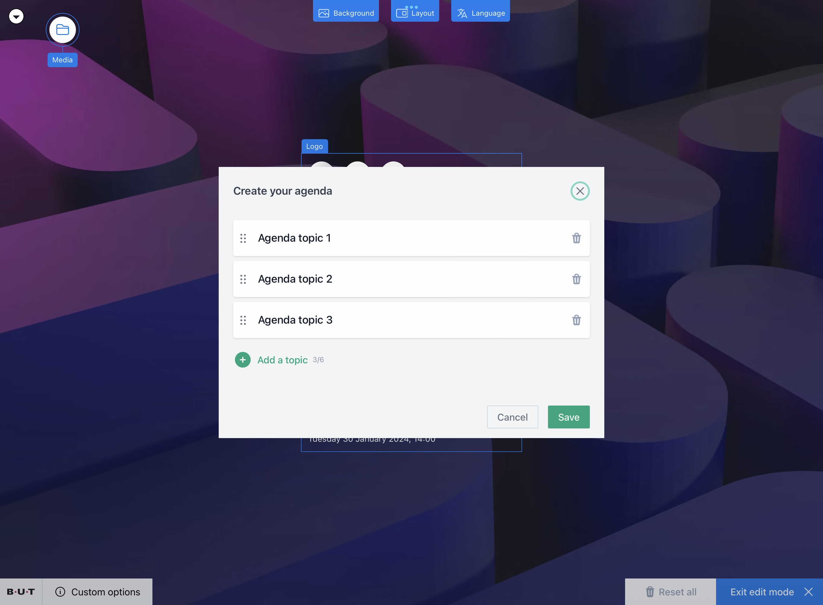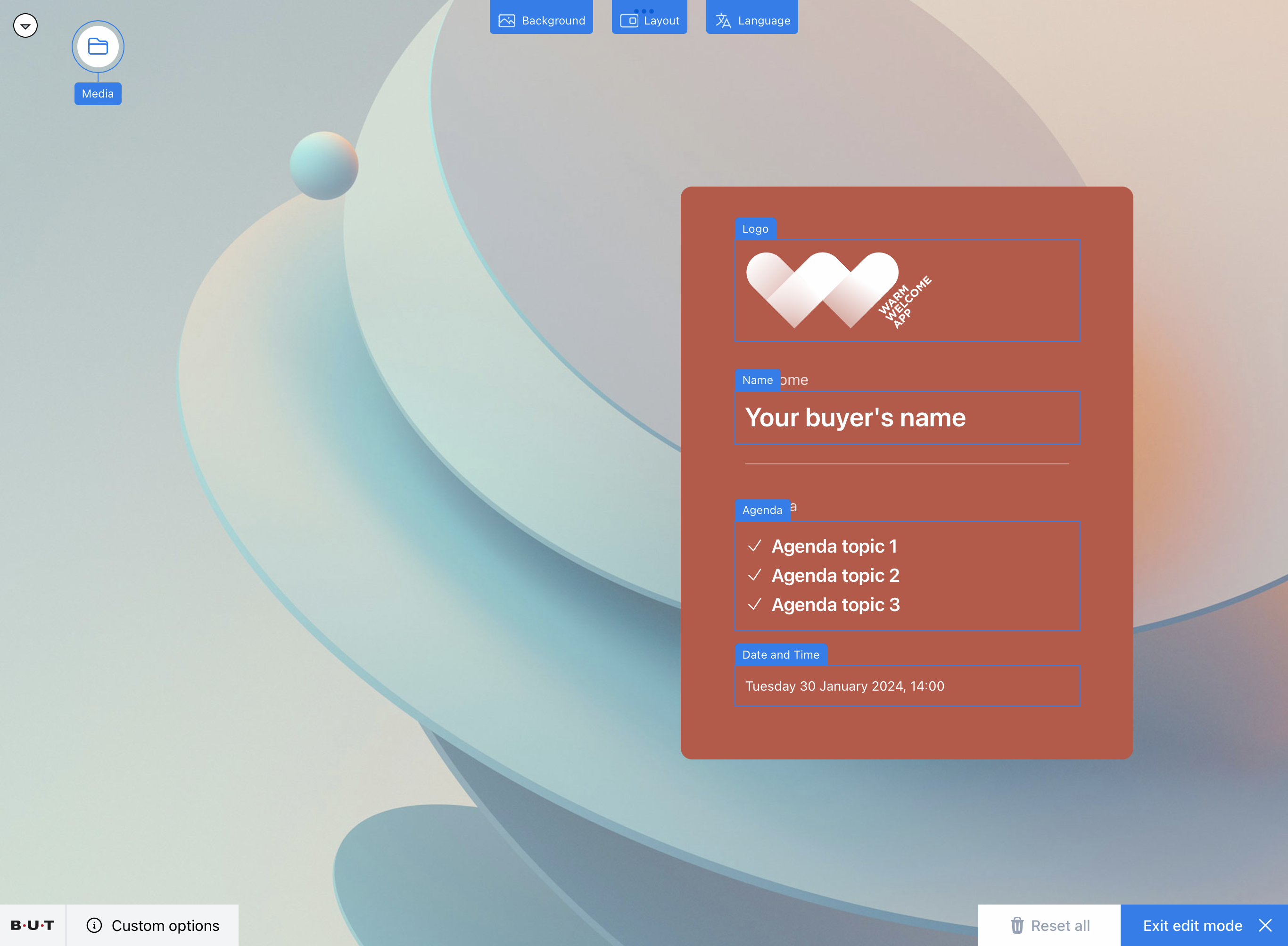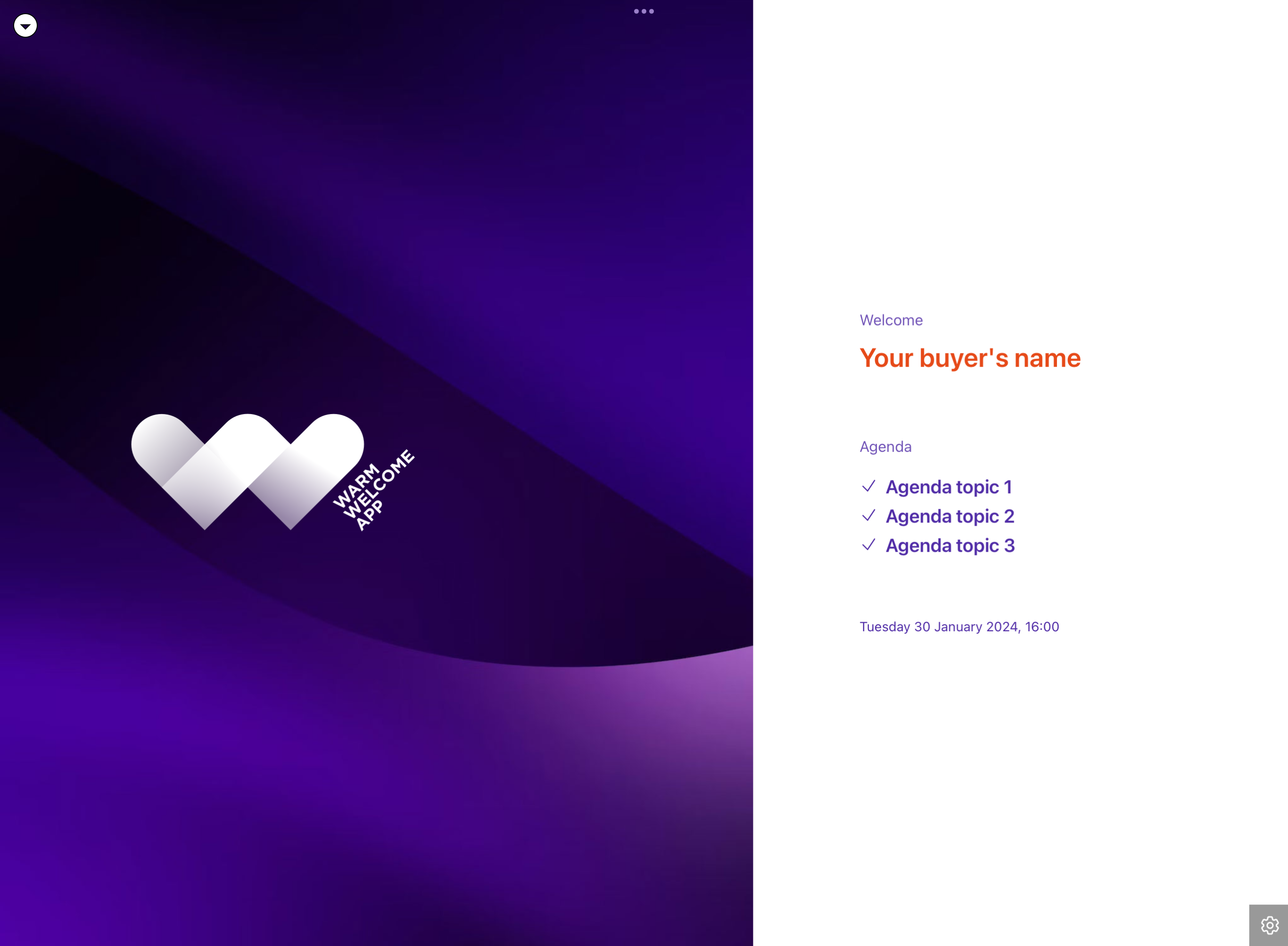 Go above and beyond by personalizing the experience with your buyer's logo, name, and agenda topics. It's not just a welcome screen; it's a tailored masterpiece that speaks volumes about your dedication to creating a unique and memorable encounter.