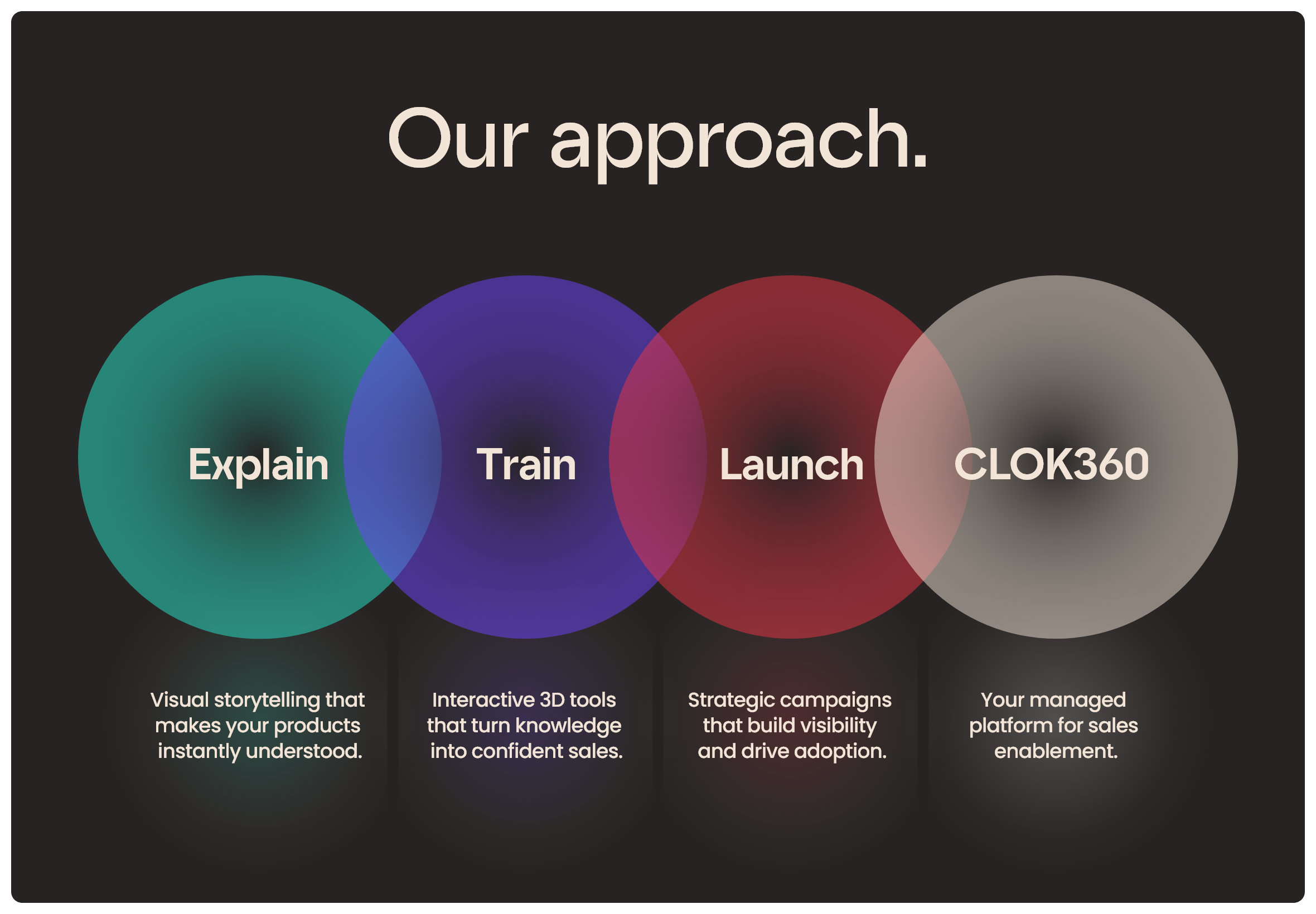 - CLOK360 service includes content and asset library planning, ongoing content support, through to custom experience development