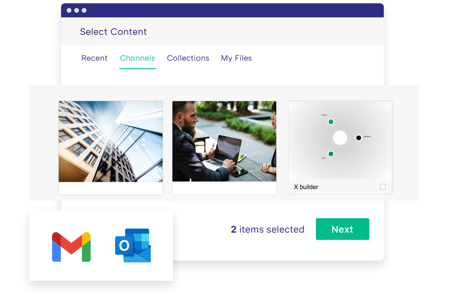 Easily find and share the latest content with buyers straight from Gmail. Quickly find the content you need – whether marketing-approved or personalized files – and explore cross-sell and upsell opportunities, all without leaving your email client.