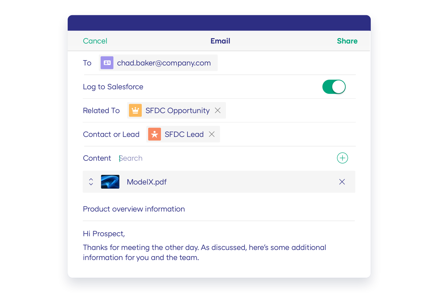 Automatically log all sent emails and prospect interactions with shared content in both Showpad and Salesforce, and gain a holistic view of how buyers are being nurtured. By linking prospect engagement insights to information such as contacts, opportunity, email body, and content shared – you always have the context needed to push a deal forward to the next stage of the sales cycle.