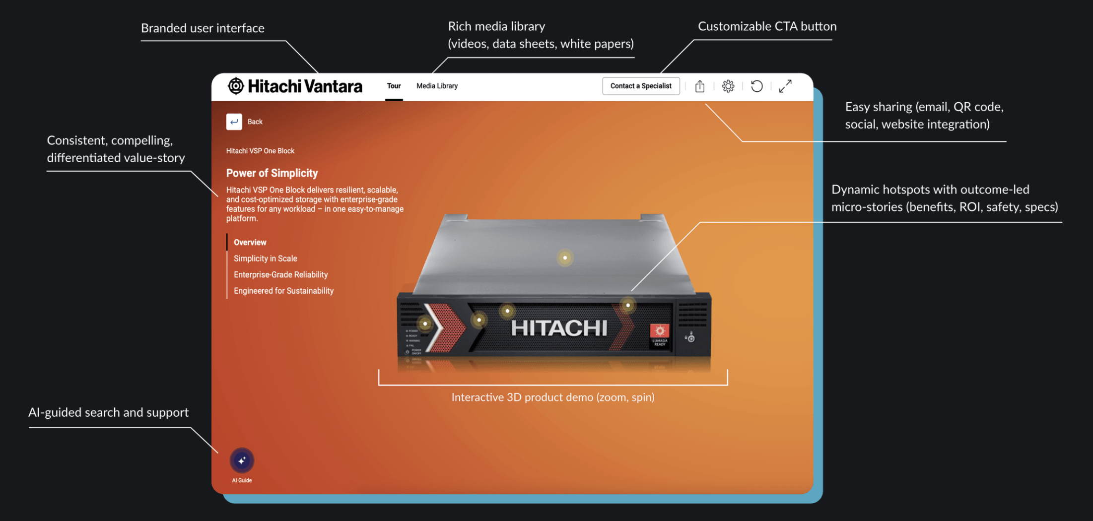For sales enablement and field marketing teams, this means consistent value-selling across regions and roles, the ability to tailor conversations to different stakeholders, and interactive experiences that support self-discovery for modern buying groups. With built-in analytics and measurable engagement insights, teams gain visibility into what resonates—enabling smarter follow-up, stronger alignment, and accelerated enterprise decision-making.