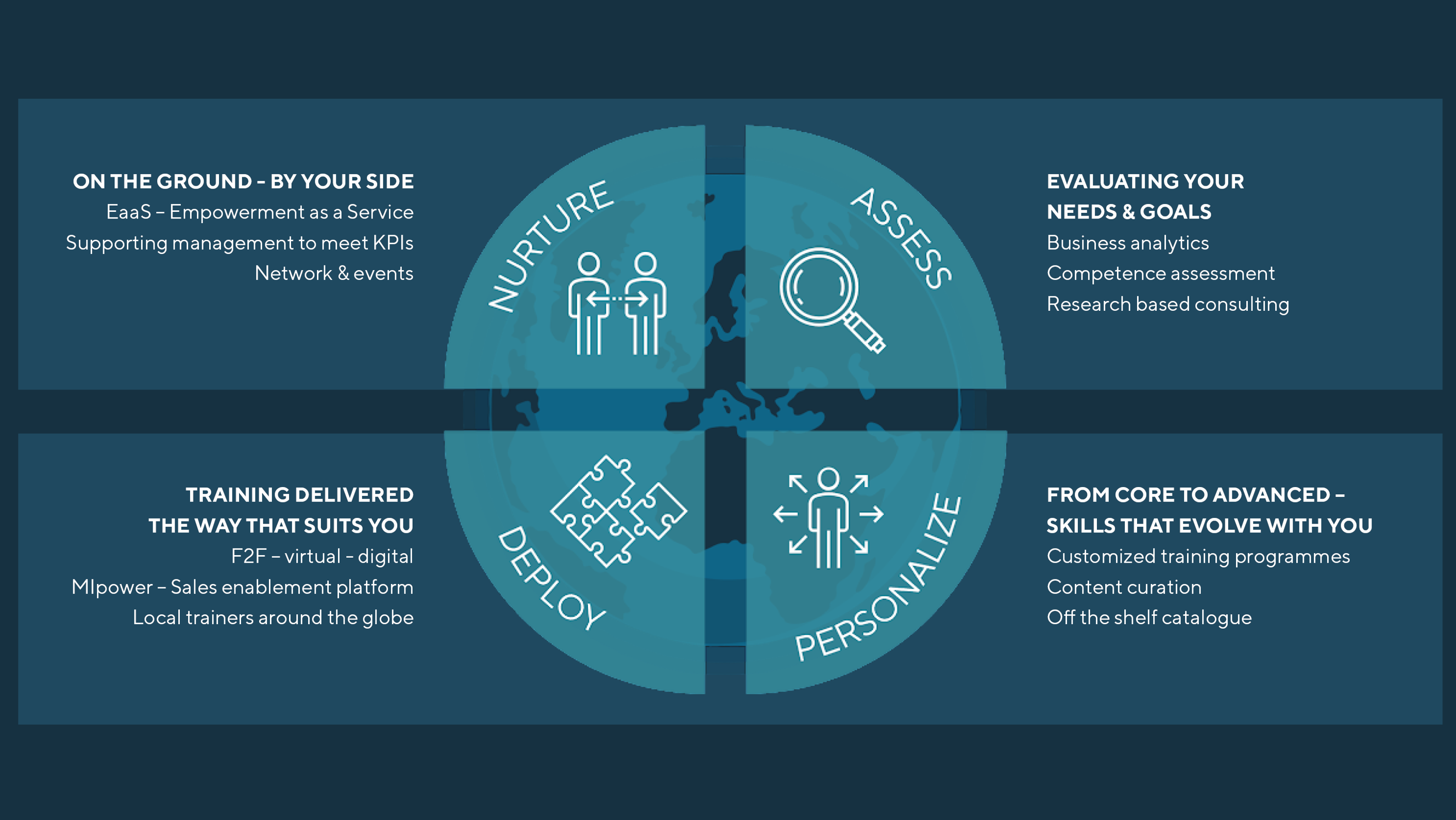 We deliver innovative learning solutions specifically tailored to your needs, helping you build successful sales teams and grow your business, by focusing on 4 main areas to create Sales Excellence: Assess, Personalize, Deploy & Nurture.Â