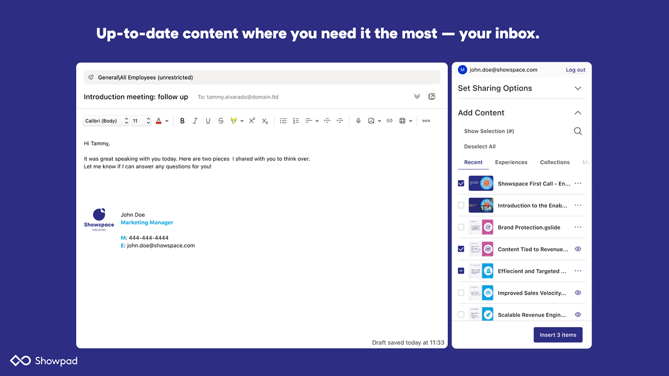 Easily find and share the latest content with buyers straight from Outlook. Quickly find the content you need – whether marketing-approved or personalized files – and explore cross-sell and upsell opportunities, all without leaving your email client.