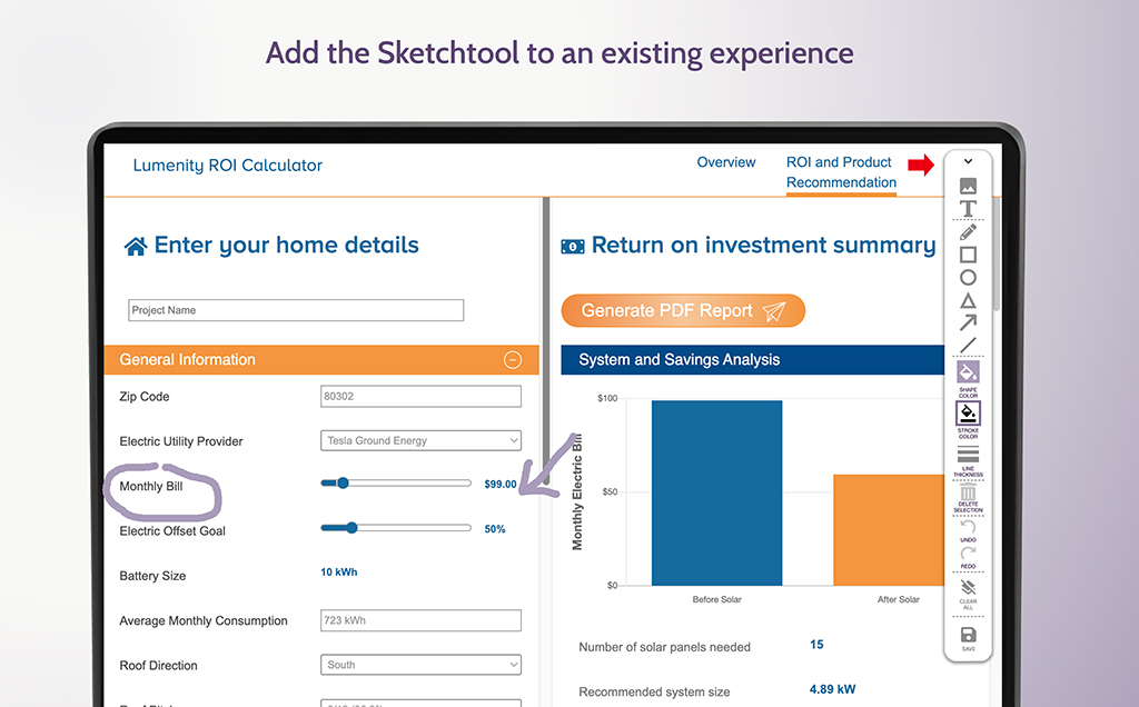You can also use Sketchpad’s functionality seamlessly with any existing Showpad Experience, such as a playbook, an ROI calculator, or a product comparison tool! Add an expandable Sketchpad toolbar to your experience that can be opened at any time so your users can draw directly within the existing experience.