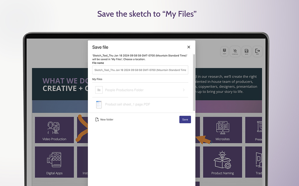 Then use the pencil, shapes, or arrow tools to connect or emphasize any element. An easy-to-use text tool with changeable fonts lets you add labels, benefits, or explanations. You can change the thickness or stroke of the pen tool, add different fill colors to shapes, or make them transparent. We can even customize Sketchpad to feature your company-branded elements such as fonts, colors, and icons. Save the edited asset to ‘My Files’ in Showpad.