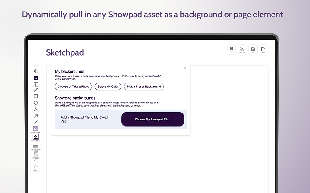 With Sketchpad you can make sure the most important messages are delivered and understood every time, right within your Showpad interface. Sketchpad lets you draw over a clean color background, or company-branded background, or dynamically pull in any asset in Showpad as a background or element. You can even pull in multiple assets to one “board” and move or size them.